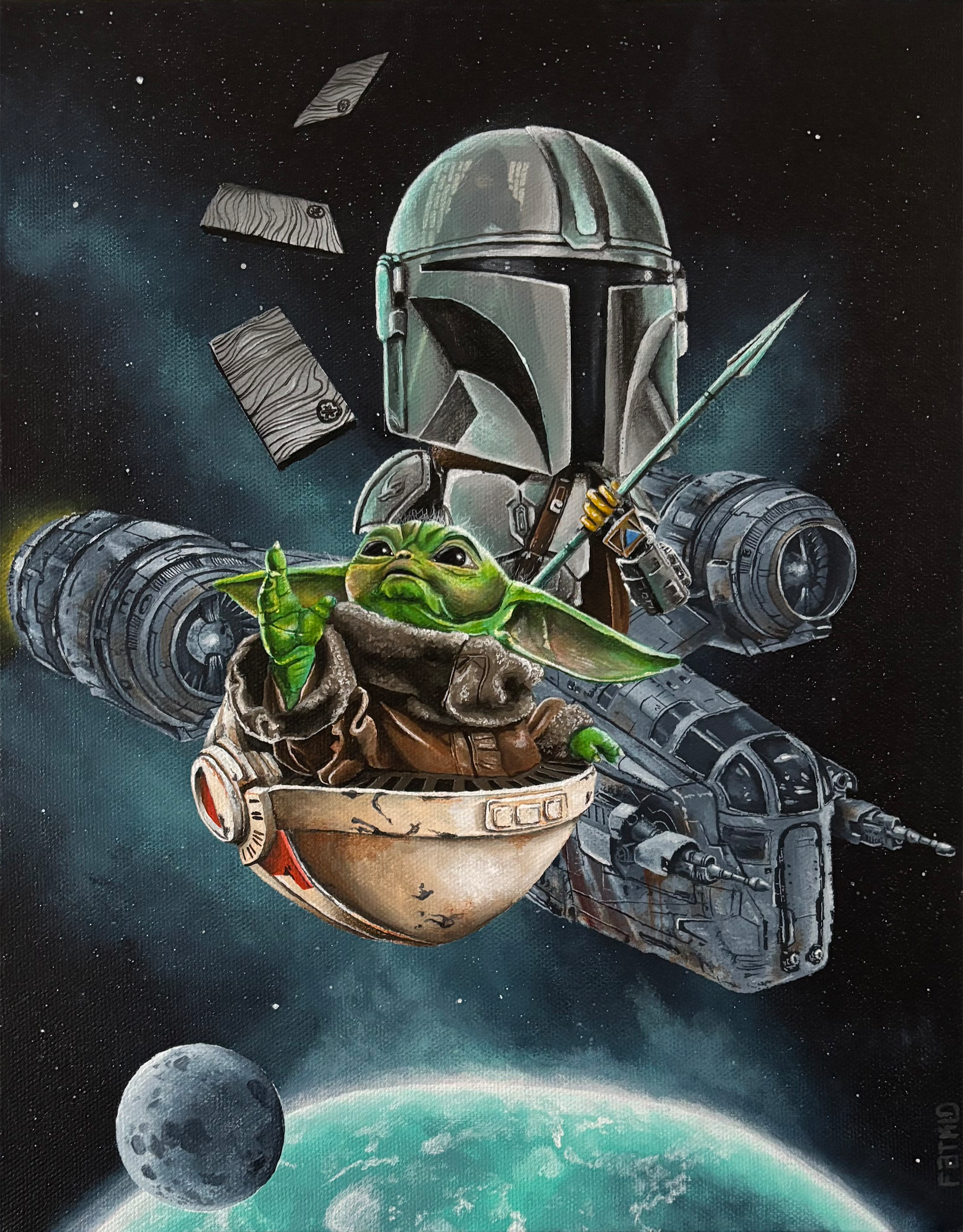 Like most of my recent paintings, this has been years in the making. A friend of mine commissioned me for a painting of The Mandalorian about 4 years ago. Fast forward to a few months ago, when I was finally ready to start painting it, I had to make sure he still wanted it, or even remembered asking for it in the first place. He did, and so I got to work. I appreciate his patience, and his incredible taste in pop culture. Every time he’s commissioned a painting, the subject matter has been so fun and enjoyable to work on.